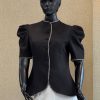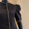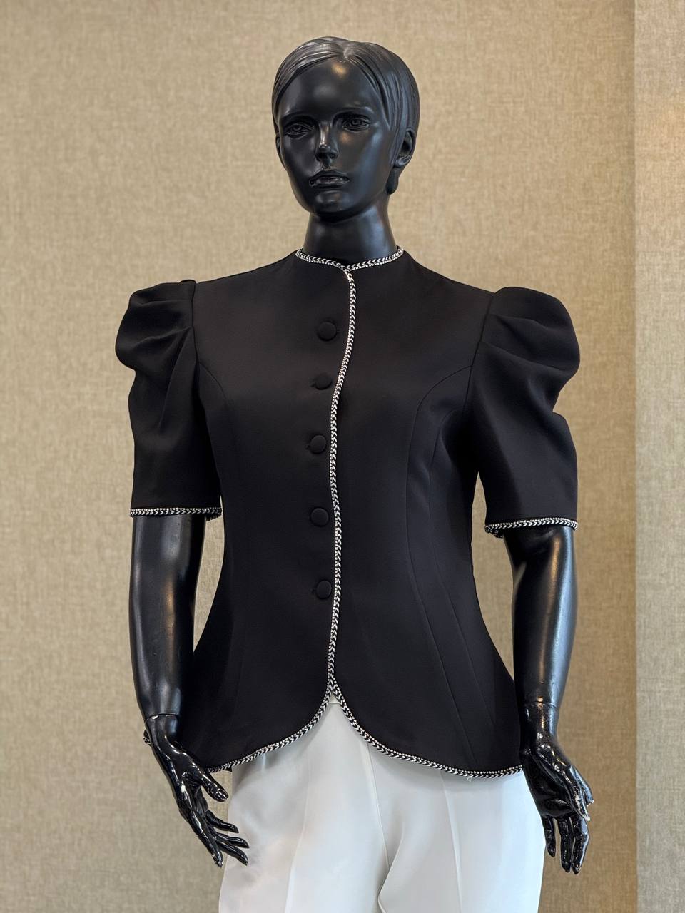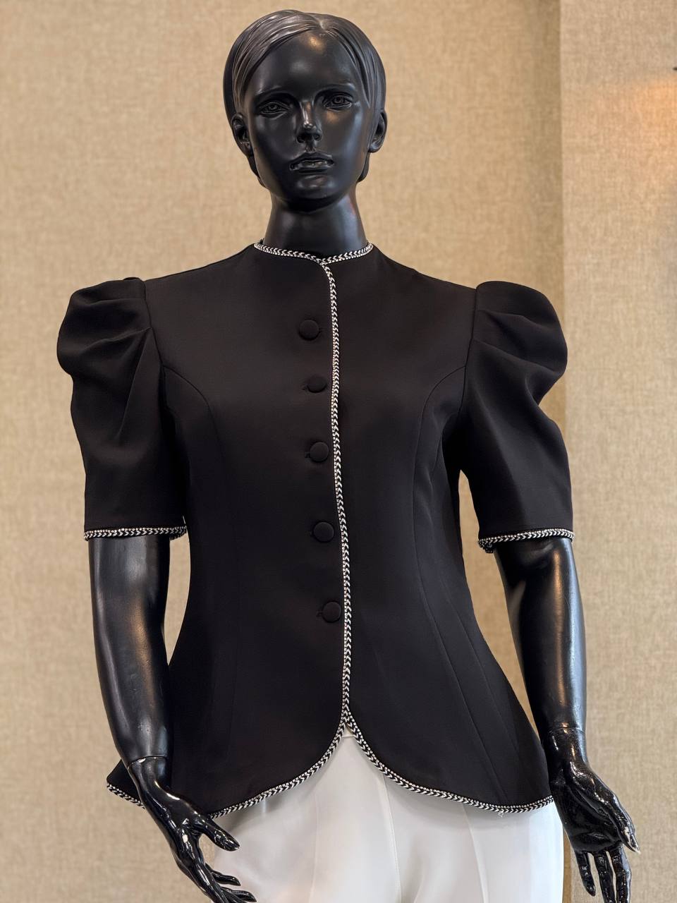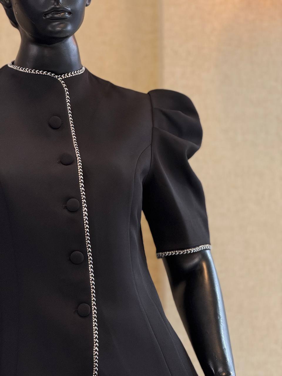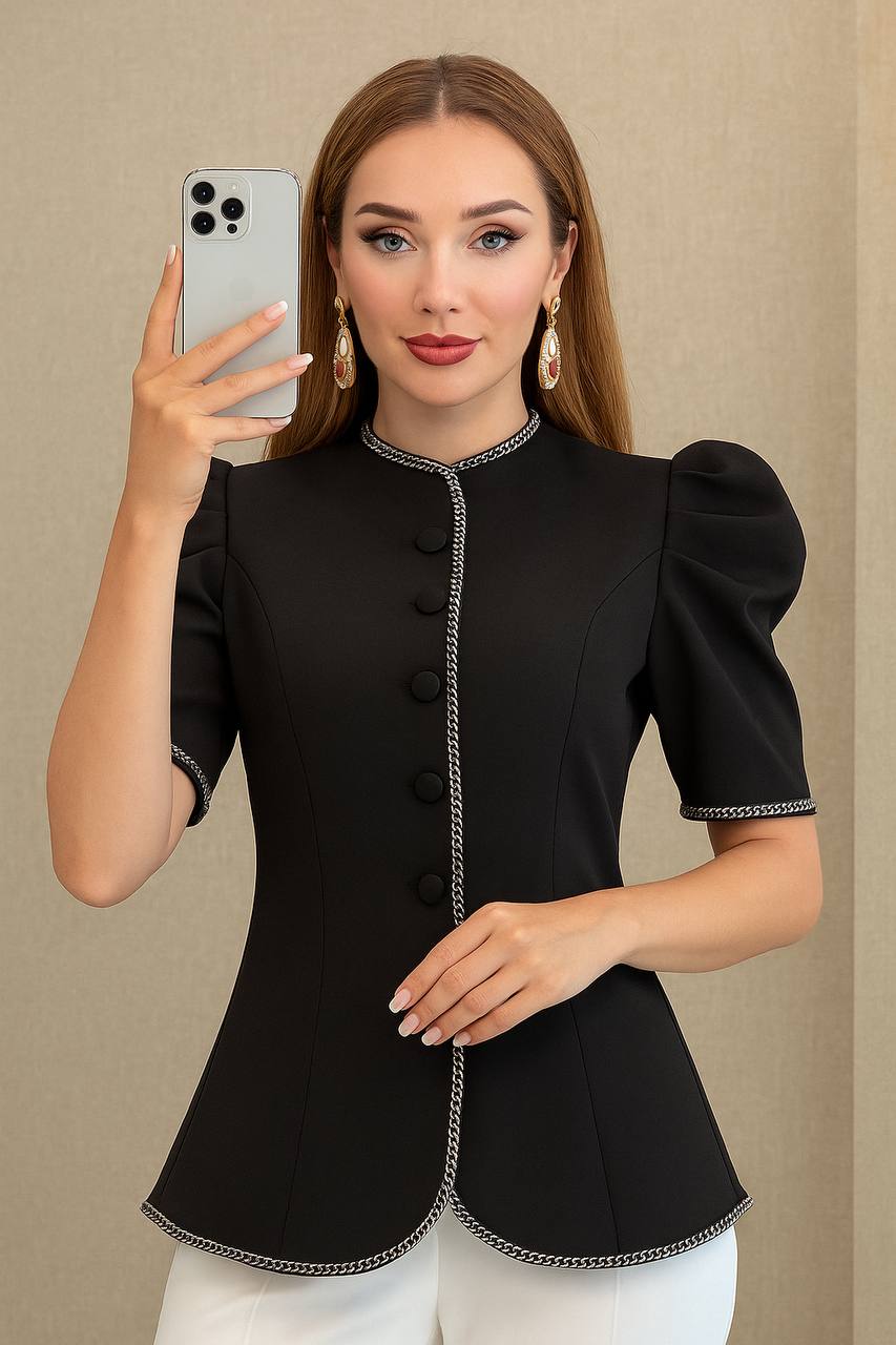 لبهها و سرآستینها با نوار تزیینی (سرمهدوزی یا خرجکار زنجیری) کار شده